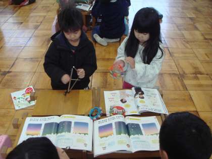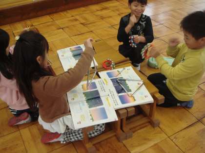 トライアングルやすずなどの楽器を使って,音作りをしました。