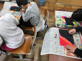 クレパスを使って「スクラッチ」をしました。赤や青などの鮮やかな色を数色選び,きれいに塗った後,黒のクレパスで一面に塗りました。こってりと隙間なく塗った方がきれいに仕上がると聞き,一生懸命ぬっていました。その後,わりばしで削りながら絵を書いていました。削った折にあらわれる色に「わぁ!きれい!!」などの声が子どもたちから上がりました。