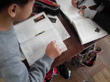 国語科「伝統文化を楽しもう」では狂言「柿山伏」の面白さを表すための音読に挑戦。ペアで山伏と柿主に分かれ,声の出し方を変えたり,動作を入れたりして,練習していきました。