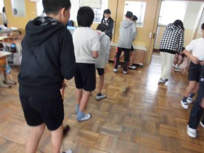 教室掃除では1列に並んでほうきをしています。力を合わせることで教室もピカピカに!