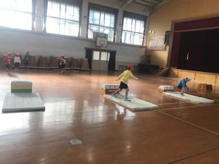1年生にとって,とびばこやマットを準備をするのはとても大変なことですが,みんなで協力して準備や後片付けをがんばっています。とびばこを「ふみこし」したり,「とびこし」したりして安全に楽しく活動することを大切にします。簡単な技がたくさんあって子どもたちは何度もチャレンジしたい!という気持ちも大きく意欲的です。