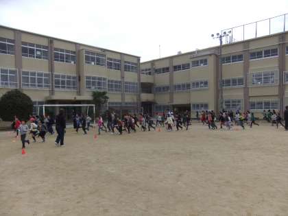 2年生の子ども達は,中間休みに放送で軽快な曲が流れると,大急ぎで運動場へ行きます。5分間で自分のペースで走ることができるので,みんなニコニコ笑顔で気持ちよく走っています。