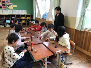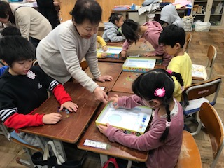 今日は,生活科「ふゆもげんきに」の一環で,女性会の方と一緒に「むかしあそび」を楽しみました。今までに経験したことのない遊びもあり,女性会の方に遊び方を教えていただいたり,友達と仲良く教え合いをしたりして楽しみました。女性会の方とともに活動するのは2回目です。子どもたちは,女性会の方とお話しするのも少し慣れてきたように見え,明るい声が聞かれました。