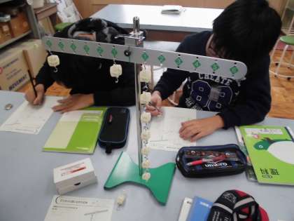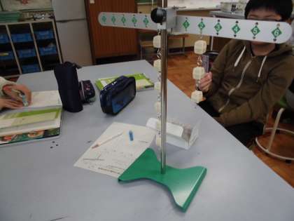 理科「てこのはたらき」では,実験用てこを使って,いろいろな所に重りをつけて,つり合うところを探しました。はじめは感覚で合わせていた子どもたちですが,少しずつきまりを見つけていけることができたようです。