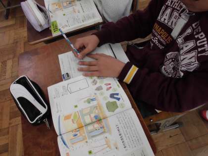 家庭科「冬を明るく暖かく」では,冬の気候について考えました。「寒い」「風が強い」「雪が降る」といった冬をどう過ごしているか,生活をふり返って工夫を書き出していきました。