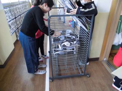 図画工作科「版から広がる世界」では,彫り上げた板にインクをつけて,和紙に刷り上げていきました。インクの量や木くずの跡などに気をつけることで,見事な作品を次々と作りあげていく子どもたち。「おぉ〜」といった歓声や「似てる〜」といった喜びの声が聞こえてきました。