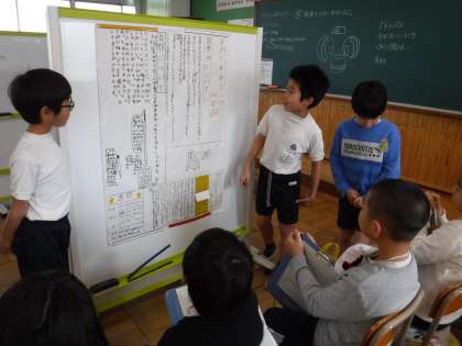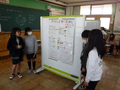 「やさしいまちづくり」に向けてポスターが完成したグループは,それを使って自分たちの思いを伝える練習をしています。発表の内容をよりよくするために,互いに聞きあって意見交流もしています。