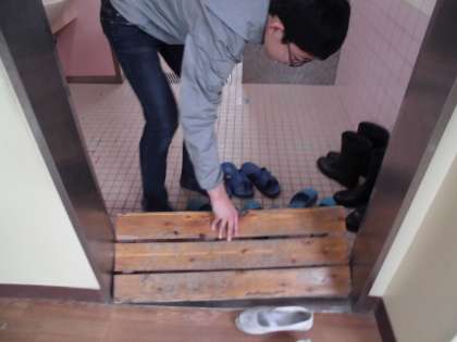 トイレ掃除では,入り口のすのこを動かして,ごみをはいています。丁寧な掃除ぶりはみんなのお手本です。