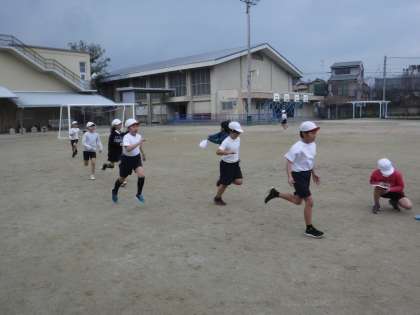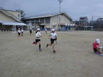 ペース走の学習では,同じペースで走ることをめあてとして取り組んでいます。「1週何秒で走るといいかな。」「35秒くらいで走ろうかな。」など,考えて取り組む様子が見られました。