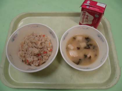鶏ごぼうごはんは,乾燥野菜や缶詰を使って作りましたが,野菜の味もしっかりとしていておいしかったです。また,ご飯を給食室の大釜で炊いたので,炊き立てでおいしかったです。