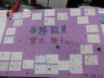 給食週間に向けて,給食を作るために支えてくれている人たちについて確認しました。調理員さんだけでなく,栄養教諭や管理用務員さん,事務職員さんなどが関わってくれていることを知った子どもたち。お礼のメッセージを集めて,1枚のボードに仕上げました。
