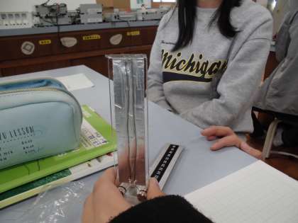 理科「電気の性質とその利用」では,太さの異なるニクロム線に電流を流して発熱の様子を調べる実験をしました。実験の結果から,電熱線の太さが違うと,発熱に違いがあることに気付くことができました。