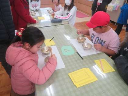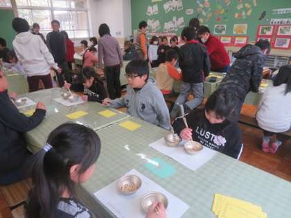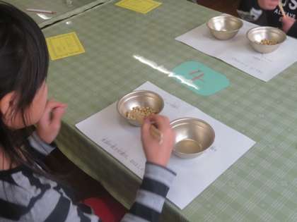 2月12日(火)から18日(金)は,給食週間です。給食週間の取組の一つで豆つまみ記録会を行っています。食器に入っている大豆を正しい箸の持ち方でつまみ,もう一方の食器にうつしています。制限時間内に何個つまめるか,がんばっています。