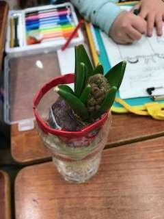女性会の方にお世話になって植えたチューリップの球根を見に行きました。球根からまっすぐに伸びた芽を見て、「ネギみたい〜」「ピンと伸びてかっこいい。」などと話していました。寒い冬でも元気に大きくなっている球根です。春になったら,何色のチューリップの花が咲くのかな。楽しみですね。また,ヒヤシンスの球根も見ました。水だけで大きくなったヒヤシンスを見て,「根っこがおもしろい!」「花の形はパイナップルみたい」などと言っていました。