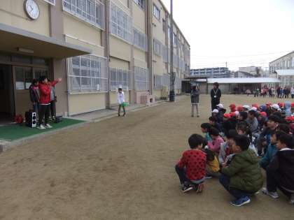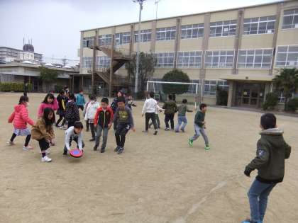 中間休み,2個のドッジビーを使って,交流会がありました。