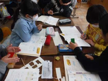 今日の学習で,子どもたちは初めて直方体と立方体について学習しました。立体を触りながら,直方体・立方体それぞれの面の数,辺の数,頂点の数などを確かめました。