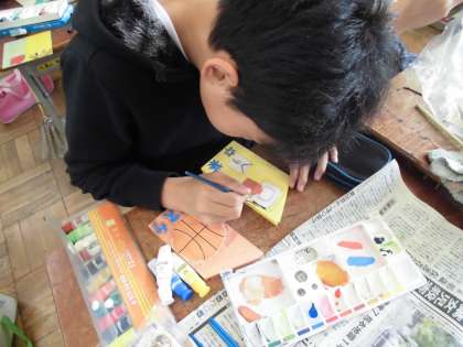 図画工作科「1まいの板から」では,「くるくるラック」の着色まで行程が進みました。「必ず混ぜる」「筆の向きを考える」など,今までの学習の成果を発揮しながら進めていく子どもたちでした。
