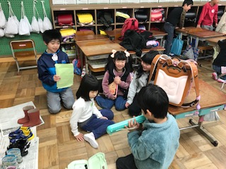 今日は雨の中,近くの保育園に通う年長さんが1年生の教室に来てくれました。今日は,1年生のみんながずっと楽しみに準備をしてきた「いちねんせいは たのしいよ」の会です。お迎えの言葉を言った後,じゃんけんゲームや手遊びうたを楽しみました。そしてグループに分かれて,ランドセルを背負わせてあげたり,1年生の教科書を見せてあげたりしました。保育園のお友達も,だんだん慣れてきて笑顔を見せてくれました。会の終わりには手作りのペンダントを渡して,「また会おうね。」「元気でね。」とお別れをしました。4月,桜が咲くころ,みんなで元気に入学・進級しましょうね!