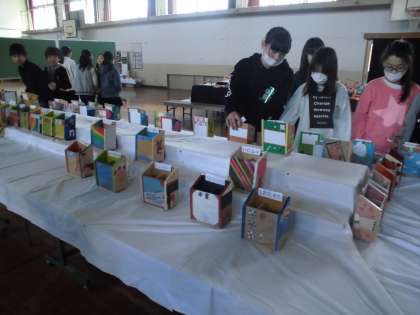 造形展に向け,体育館へ作品を搬入しました。どこに置いたらよく見えるか,考えて置いていきました。