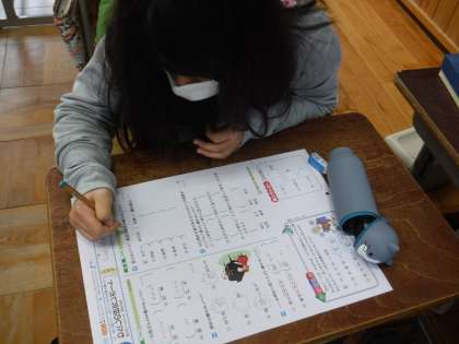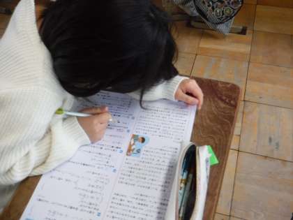 「わたしの研究レポート」は単元のまとめテストでした。「です・ます」「〜だ・〜である」のどちらかにそろえること,引用の時には「 」を使うことなど,学んだことを生かして取り組んでいました。