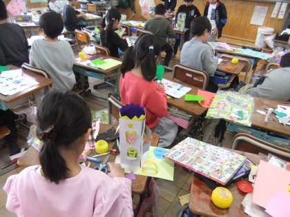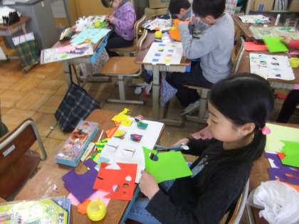 自分で窓の形や窓の中の絵を考えて色紙で工作しました。