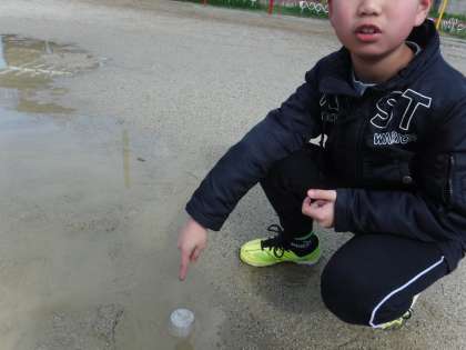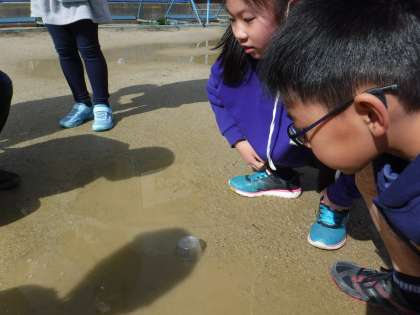 「自然の中の水」では,運動場にたまった水がどのように変化するのか調べました。水溜まりに透明のカップをかぶせると,カップが曇る様子を観察していました。