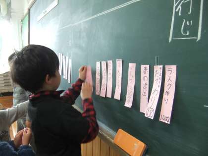 国語科の学習で,2年生の1年間を振り返りました。子ども達に一番心に残っていることを聞きました。運動会や学習発表会などの行事の他に,たてわりやラスク作り等を選んでいました。学習では,図画工作科の作品作りが多かったです。中には,みんな遊びや道徳の学習を選んでいる子もいて嬉しい驚きでした。
