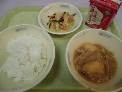 肉じゃがは,赤みそとトウバンジャンを使ってピリカラみそ味にしました。しっかりとした味つけで,ごはんとの相性が良かったです。児童からは,「程良い辛さで美味しかった」「じゃが芋が柔らかくて美味しかった」などの声を聞かせてくれました。