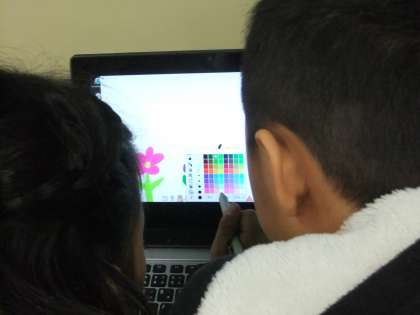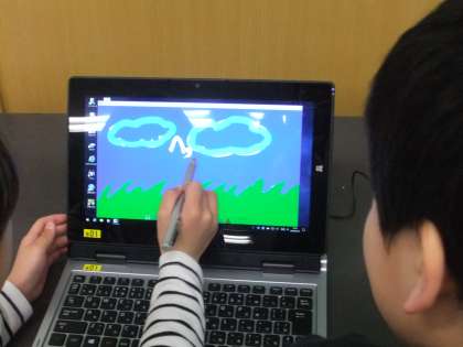 電源の入れ方や消し方,ソフトを使ってペイントをしました。タッチペンを上手に使い,ペアで協力して素敵な絵ができました。