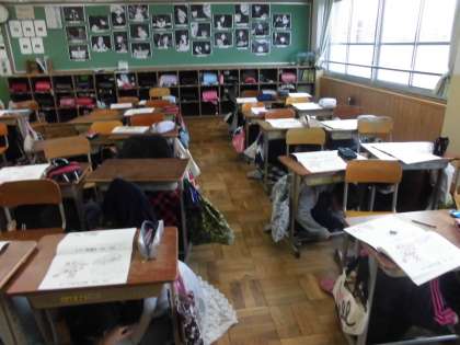 3月11日(月)の9時30分よりシェイクアウト訓練に取り組みました。素早く机の下に身をかくす姿はさすがでした。