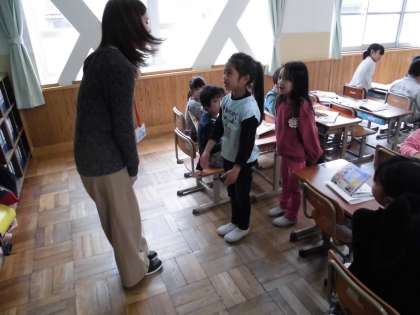 国語科では「なんて いうのかな」という学習で,どのような声かけをすればよいのかを考えました。朝の場面では,先生に「おはようございます」と言えばよいのが分かったようです。