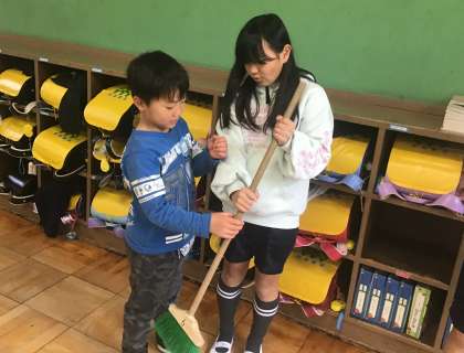 初めてのお掃除は,分からないことがたくさんです。6年生として,1年生に掃除の仕方をアドバイスしました。しばらく一緒にお掃除します。がんばれ1年生。