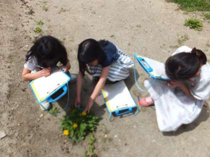 理科の学習で,学校の中にある自然を観察しました。植物や動物など,自分が見つけたものの,色や形,大きさに注目して観察をしました。教科書についている図鑑を参考にしながら,草花の名前を調べ,虫眼鏡を使って,細かい部分まで観察することができました。