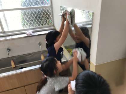 掃除時間には,自分の教室だけでなく,手洗い場やランチルーム前なども掃除をしていきます。砂を払ったり,床を磨いたり,きれいにするために集中して頑張っています。