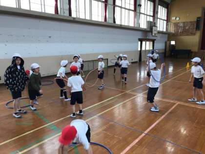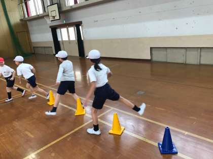 体育科の学習で,体ほぐし運動を行いました。今回は,体育館にマットやコーン,フラフープなどを設置して,まねっこ駆け足をしました。班のみんなが楽しめるような動きを考えたり前の人の動きを追ったりと,楽しみながら運動をすることができました。