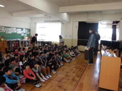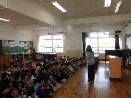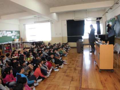 4月18日(木)の1校時に,音楽室で1年生全員が勢ぞろいしました。各担任団の自己紹介や学年目標についての紹介,1年生を迎える会の練習などをしました。ずっとよい姿勢で聞く子も見られましたよ。