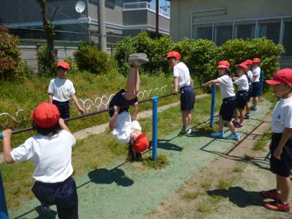 1年生のときにできなかった技ができるようになったり,連続でできるようになったり,いろんな技に挑戦して楽しんでいます。「手にまめができた〜!」と言いながら,がんばって練習しています。