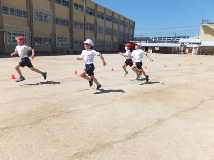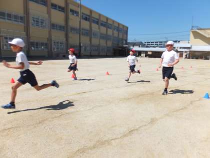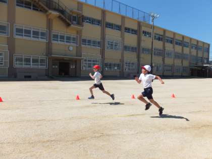 3年生の体育で,50m走を行いました。最後まで自分の力を出し切ろうと頑張っている子が多かったです。2年生よりも記録が伸びていることをとても喜んでいました。