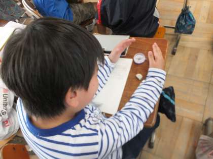 3年生の社会科の学習で,方位磁針を使って,方位を確かめる学習を行いました。方位磁針を平らなところに置き,どちらが北になるかを確かめたり,自分が向いている方角を調べたりすることができることが分かりました。