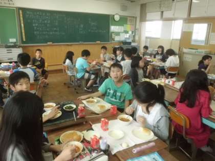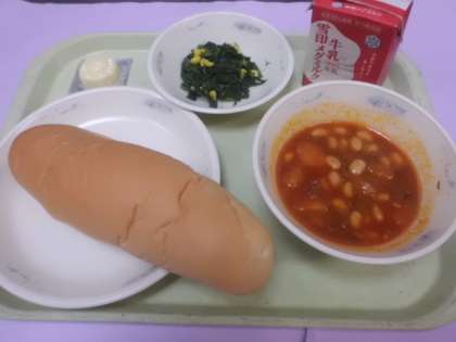 大豆と牛肉のトマト煮は,玉ねぎや人参の野菜の甘さが汁にでていました。また,パンとの相性も良く食べやすい味でした。児童からは,「パンと一緒に食べるとおいしい」「大豆が柔らかかった」などの声を聞かせてくれました。