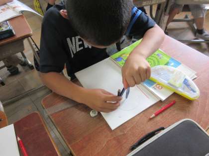 算数科の「円と球」の学習で,コンパスを使って円をかく学習を行いました。