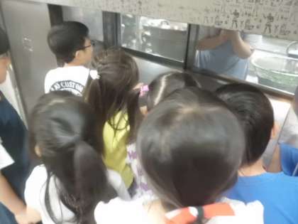 今日は,1年2組の児童が給食室に見学に来てくれました。サービスホールの中からですが,調理室の様子を楽しそうに見ていました。また,給食室にある大きい調理器具や約580食分の食材の量に驚いている様子を見せてくれました。