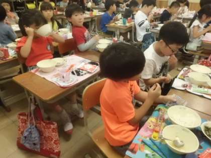 給食時間では,目の前でみた食材という事もあり,「さっき見ていたやつだ」「大きい道具で作ったのかな」など楽しそうに食べていました。