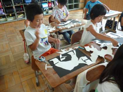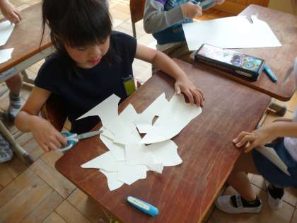 図工「はさみのあーと」では,白い画用紙を自由に切り,面白い形を見つけて楽しみました。次回は切った形を見て,想像を働かせ,黒い画用紙の上に貼ってみます。どんな作品が出来上がるか,楽しみです。