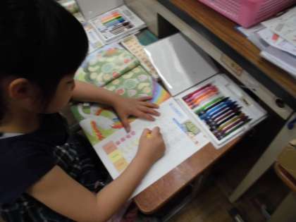 算数科「かずとすうじ」では,果物の数を数えて,その数だけ果物の色を塗る学習をしました。数を数えなくても,グラフの高さに注目することで,大小が分かることに気づくことができた子どもたちでした。