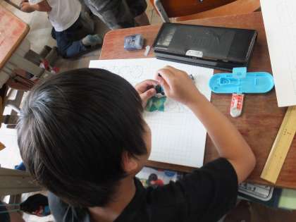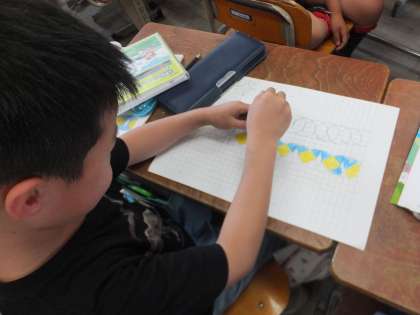算数科の円と球の学習で,コンパスを使って様々な模様づくりに挑戦しました。どこを円の中心にして重ねると,見本通りの模様になるのか,はじめはじっくり考えていましたが,やりながらコツをつかむとスイスイ模様を作ることができていました。