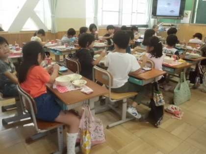 給食時間も実際に見学した食材が目の前に出るので味わって食べていました。