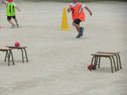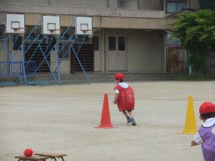 体育の学習でおきかえリレーをしました。紅白玉を台に置き換える,最後までしっかり走るなどをめあてにグループで協力して頑張っていました。