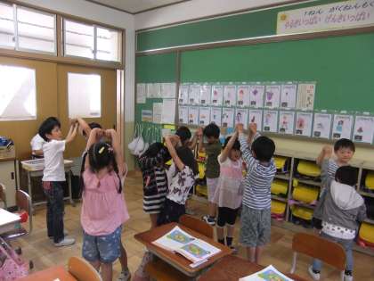 「ひらいた ひらいた」の歌を歌いながら,二人組で手をつなぎ,蓮の花を思い浮かべながら手を伸ばしたり縮めたりして歌遊びをしました。