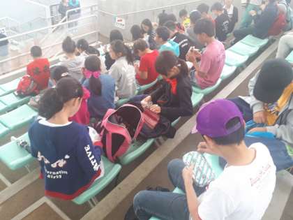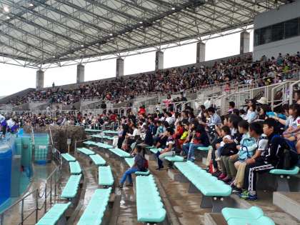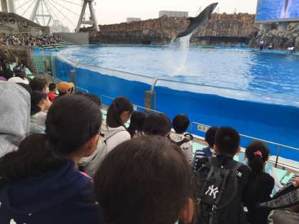 まずは、イルカショー見学です。将来、水族館の飼育員になりたいなと、ワクワク、見ている子どももいます。
